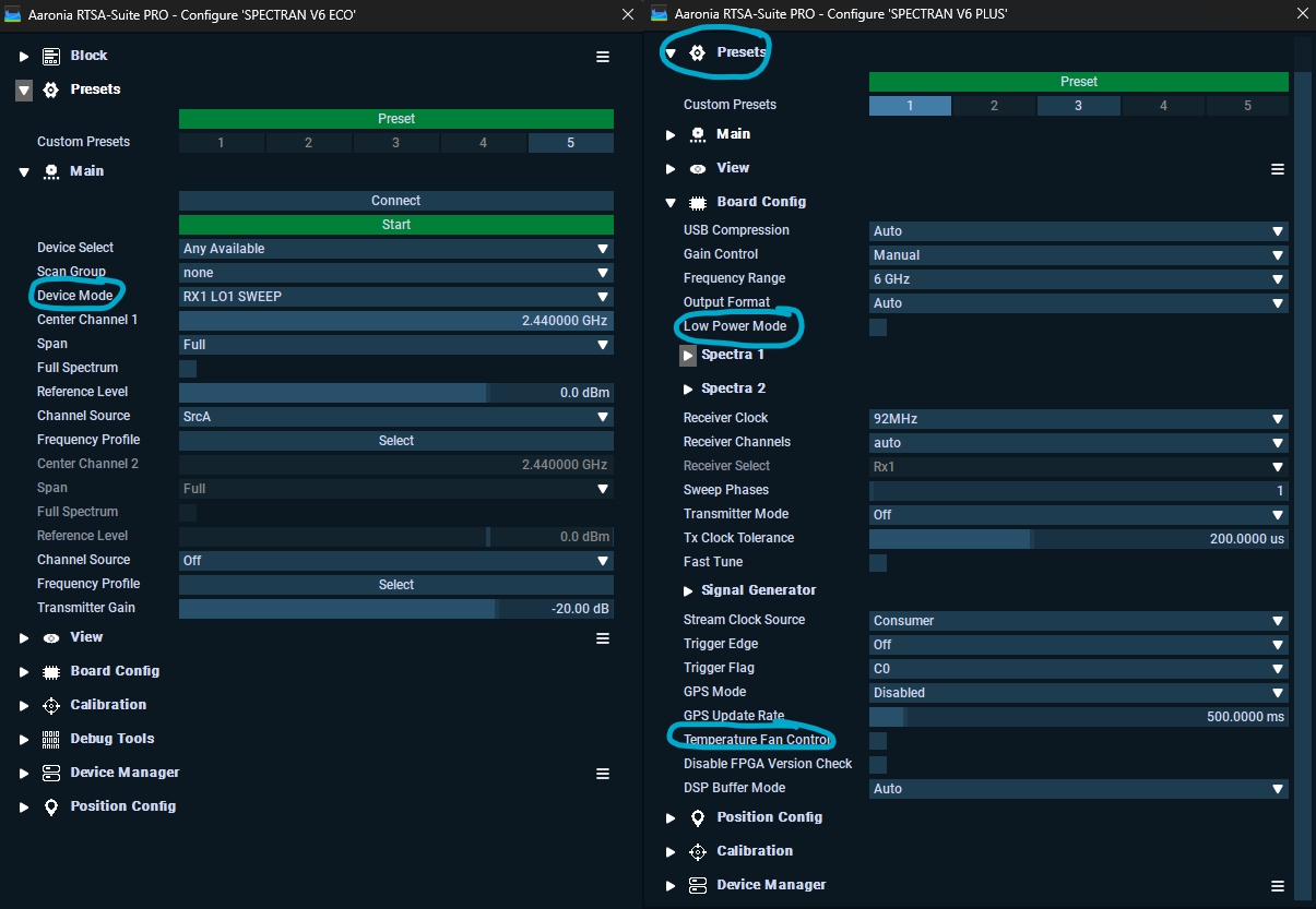 You can for example turn on the V6 Plus to Low Power Mode (disable the Tx and FFT streamings (Spectra1 & Spectra2)), turn on Fan Control so the fan will not run at 100% fan speed all the time, save all your setting as a template and many other settings that you can also find in the top menu.