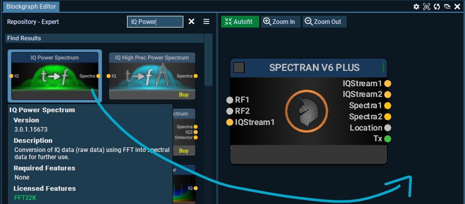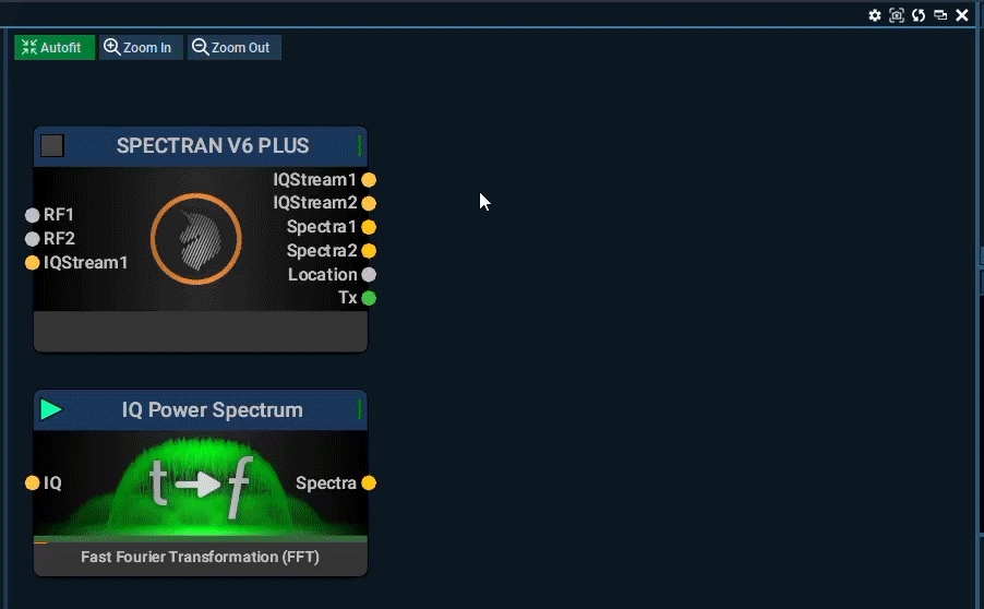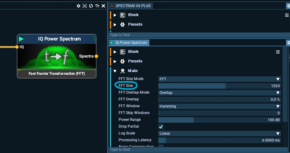 This block converts IQ data (raw real-time data) using FFT into Spectra data, the base license has a 32K FFT feature but this can be upgraded around 1M FFT.