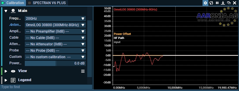For example, if you're using the OmniLOG Pro 30800 from Aaronia, the complete gain diagram will be available in the Calibration block. When added, the Spectrum View will apply the antenna’s loss and gain, providing more accurate measurement data.