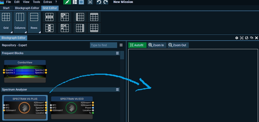 Drag the Spectran V6 Plus or Spectran V6 Eco block to the blockgraph editor window the the right.