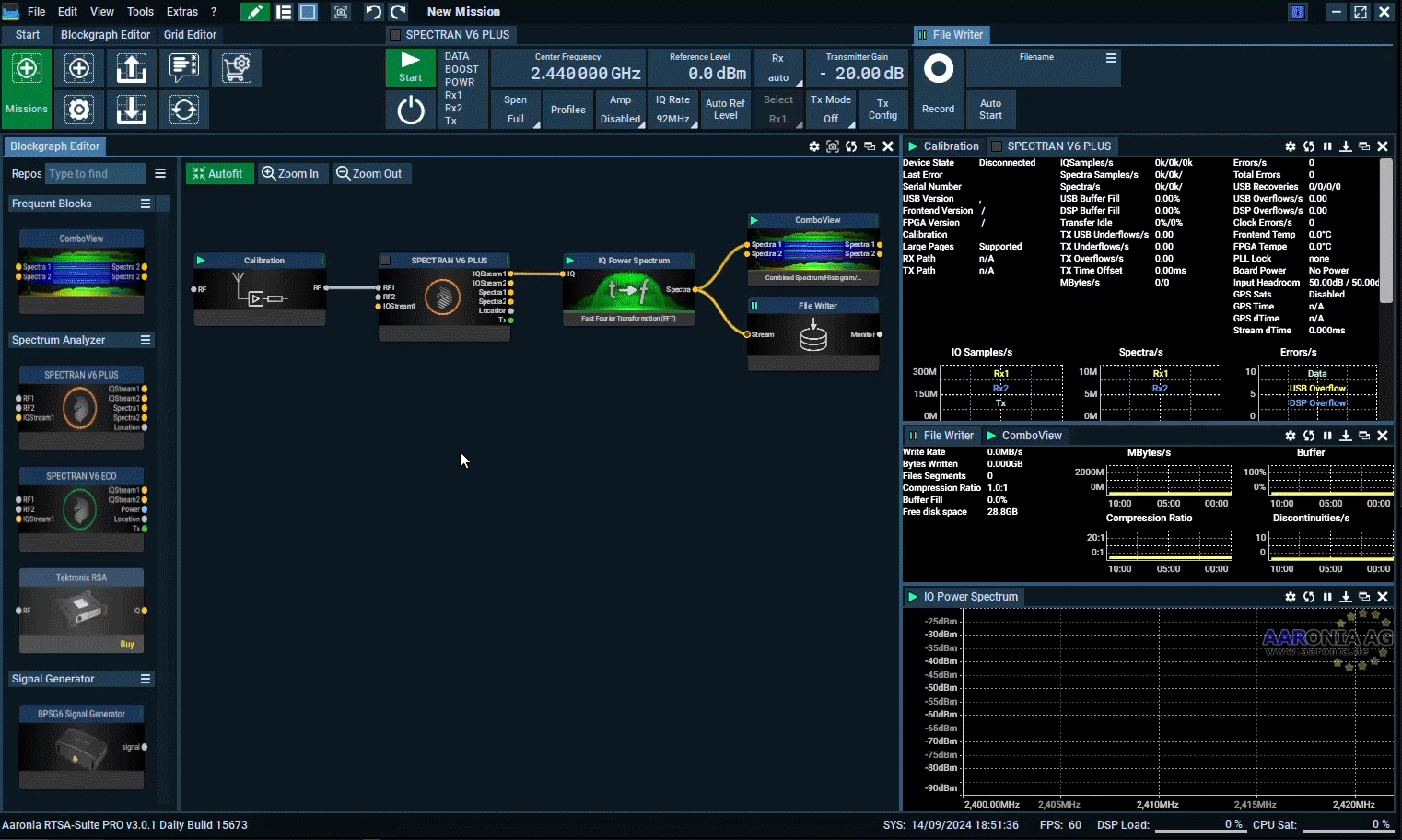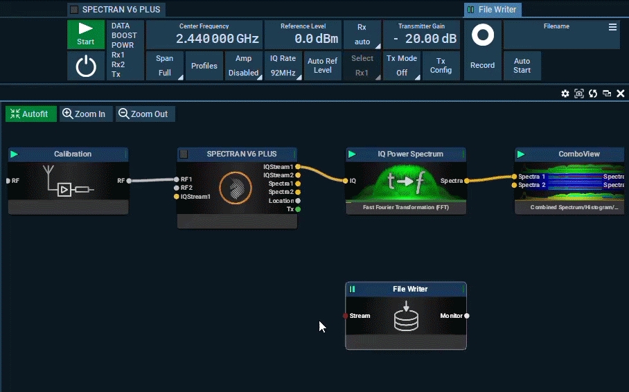 In this lab, we will do it a bit different than the Factory Mission and use the ComboView Block that can display spectrum, histogram and waterfall in one block. Where each of them can be paused, removed all in one single block.