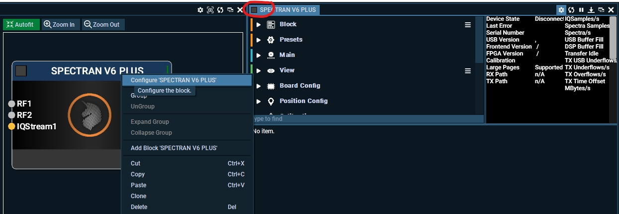 When the block is added, open up the settings for the block by right-clicking the block and press Configure, or double tap the the "Spectran V6 Plus inside the mission window.