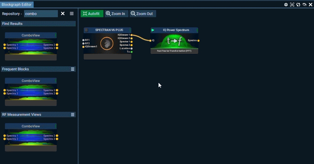 Find the block in the block repository on the left, and add the block to your mission and drag a line from from the IQ Power Spectrum to the Specta Input on the ComboView.